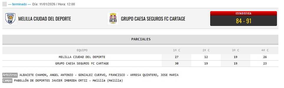 El último cuarto fue el más exigente. Melilla apretó y llegó a colocarse a solo tres puntos (69-72), pero ahí apareció la madurez de un CB Cartagena que no se dejó llevar por los nervios. Un parcial final muy bien ejecutado, con acierto desde el tiro libre y buenas decisiones en ataque, sentenció el partido hasta el definitivo 84-91.