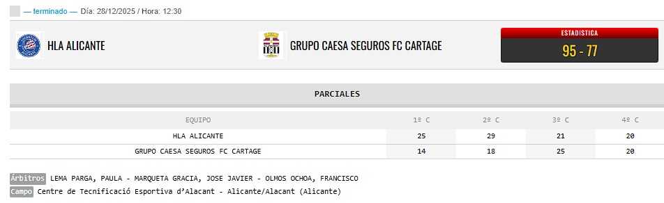El encuentro arrancó con muchas dificultades para el CB Cartagena, que salió a pista con Webster, Davis, Spencer, Doménech y Robinson, pero pronto se vio superado por la intensidad del HLA Alicante. En apenas dos minutos y medio, los locales firmaron un contundente 11-0 que obligó a reaccionar desde el banquillo cartagenero. Lejos de enderezarse la situación, Alicante siguió castigando cada error visitante y amplió la brecha hasta el 19-5 mediado el primer cuarto. El parcial concluyó con un claro 25-14 que ya marcaba el rumbo del choque.