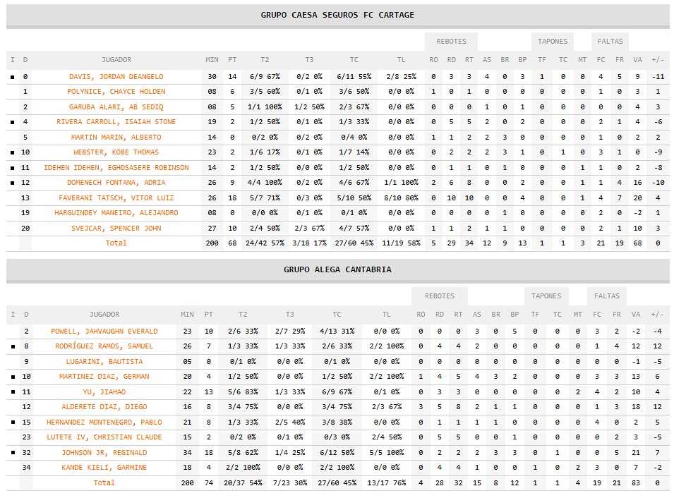 El último cuarto ofreció el mejor rostro ofensivo del CB Cartagena, con 21 puntos anotados, aunque la respuesta del Grupo Alega Cantabria fue contundente (28), neutralizando cualquier intento de remontada y cerrando el partido con solvencia. A nivel individual, Jordan Davis volvió a asumir galones en el conjunto local, mientras que Reginald Johnson Jr. fue determinante en las filas visitantes, especialmente en los momentos decisivos.
