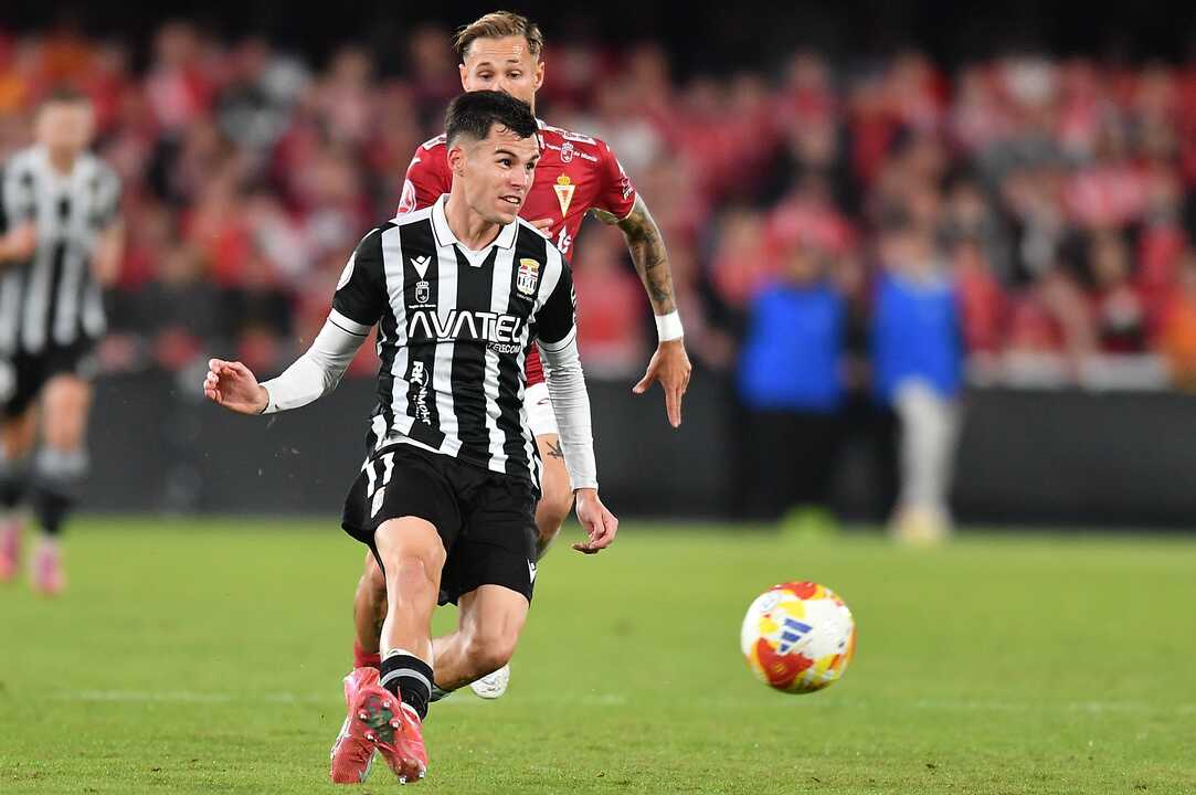 En otra jugada a balón parado el conjunto grana estuvo cerca de incrementar la renta, en esta ocasión fue Alberto González quien remataba de cabeza otra vez dentro del área, aunque en este caso el testarazo se estrellaba en el palo derecho de la portería local. Poco a poco el equipo de Javi Rey fue ganando metros, aunque el Murcia estaba bien posicionado sobre el verde.