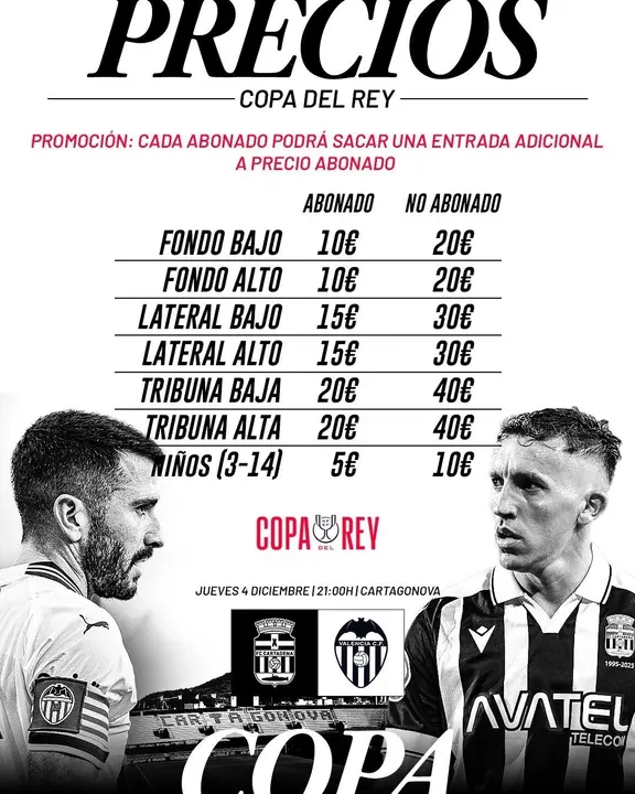 El FC Cartagena ha anunciado que ya se encuentran disponibles las entradas para el partido de Copa del Rey que enfrentará al equipo albinegro con el Valencia CF el jueves 4 de diciembre a las 21:00 horas en el Estadio Cartagonova. Los precios, pensados para favorecer un gran ambiente en las gradas, parten desde 10 euros para los abonados y 20 euros para los no abonados, dependiendo del sector del estadio.