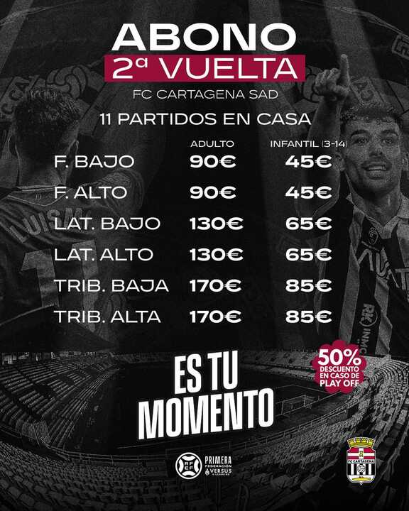 Como incentivo adicional, el FC Cartagena ha anunciado que los abonados de esta segunda vuelta se beneficiarán de un 50% de descuento en el abono del playoff de ascenso, en el caso de que el equipo logre clasificarse para esa fase de la competición. Una medida que busca premiar la fidelidad y el compromiso de quienes acompañen al equipo en este tramo decisivo.