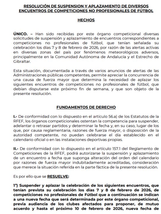 La decisión ha sido adoptada por el juez único de competiciones no profesionales, tras evaluar los informes y avisos emitidos por las administraciones públicas competentes. Esta situación ha afectado a varios partidos previstos para los días 7 y 8 de febrero de 2026, especialmente a aquellos equipos que debían desplazarse durante el fin de semana para la disputa de sus compromisos ligueros.