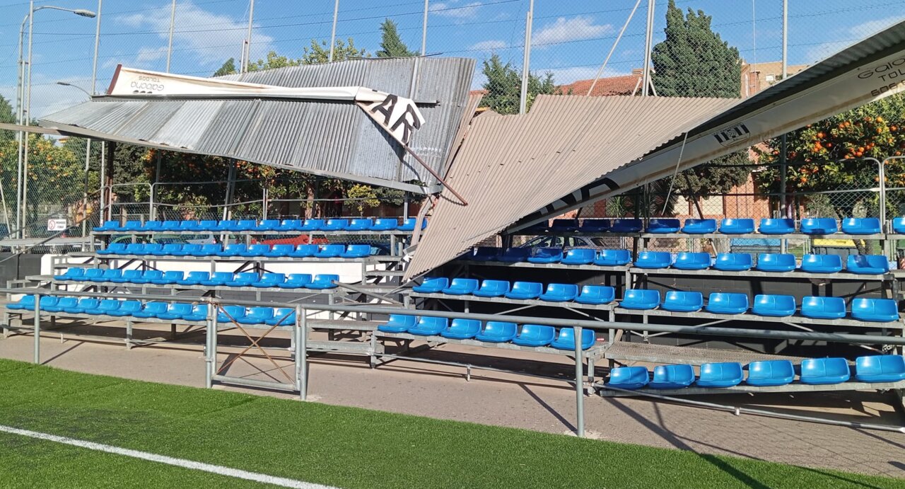 Tal y como se muestra en las imágenes publicadas por ‘@MeteoCartagena’ en su cuenta de X, el techo de la instalación quedó partido por la mitad con la suerte de que éste acabó dentro del campo y no en la acera colindante, algo que podría haber provocado daños mayores. El derribo de la cubierta metálica conllevó que parte de las vallas de sujeción cedieran hacia la calle.