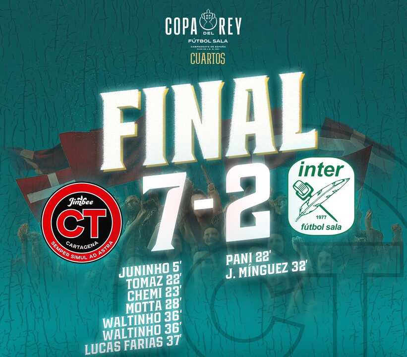 El Jimbee Cartagena firmó una noche de reivindicación en el Palacio de los Deportes tras imponerse con contundencia al Movistar Inter (7-2) en los cuartos de final de la Copa del Rey. El conjunto melonero, que llegaba tras varios compromisos ligueros dejando algunas dudas en su juego, ofreció una versión sólida, intensa y muy eficaz para sellar su pase a semifinales y recuperar sensaciones en el momento clave de la temporada.