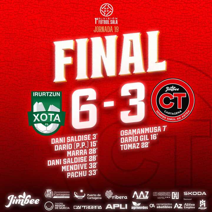 Osasuna Magna arrancó con intensidad y pronto encontró premio. Dani Saldise abrió el marcador en el minuto 3, poniendo cuesta arriba el choque para los cartageneros. Aunque el Jimbee intentó asentarse con posesiones más largas y buscando profundidad por bandas, los locales ampliaron distancias por medio de Darío en una acción a balón parado.