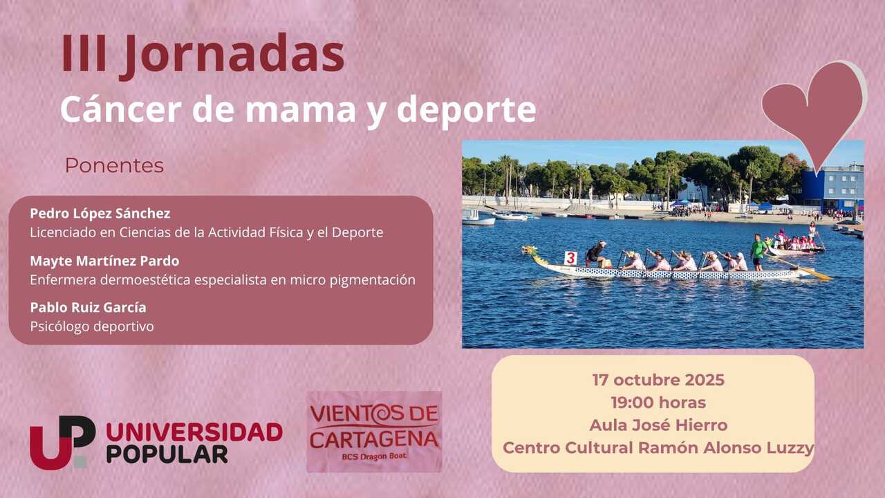 El aula José Hierro del Centro Cultural Ramón Alonso Luzzy acoge este viernes, 17 de octubre, a las 19:00 horas, las III jornadas Cáncer de Mama y Deporte, impulsadas por la Asociación Vientos de Cartagena y la Universidad Popular. La iniciativa busca dar a conocer los beneficios de la actividad física, especialmente los deportes náuticos como el dragon boat, para mujeres que padecen o han padecido esta enfermedad. La entrada es libre, hasta completar aforo.